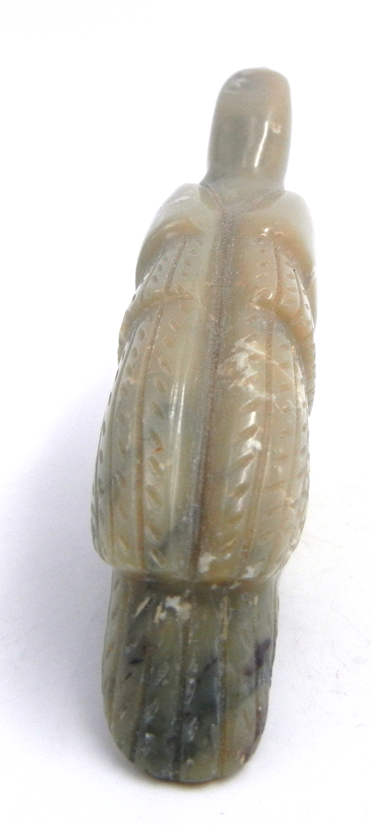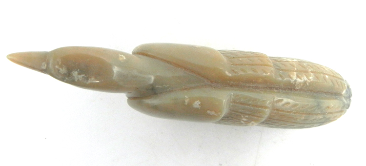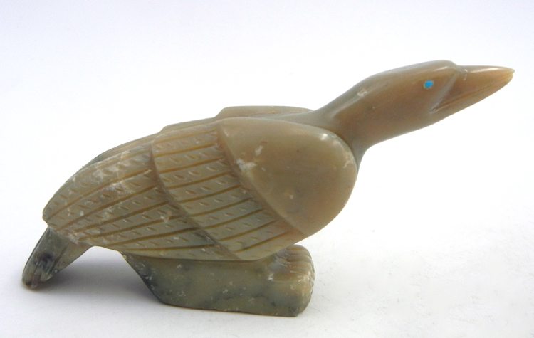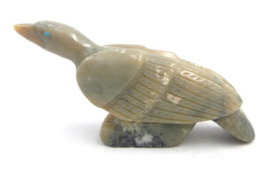 Polished, tan-grey Picasso marble comprises the entirety of this fun eagle fetish by Zuni carver Travis Nieto. The eagle’s wings are pinned to its sides, etched with delicate fine lines, making them more life-like. The eagle’s tail feathers are bunched together and tilt downward, while the eagle stands upon a perch, its head extended forward and eyes inlaid with tiny turquoise pieces. In many Native American cultures the eagle represents great integrity and a soaring spirit, and a teacher. 1 3/4″ tall x 3/4″ wide x 3 5/8″ long.